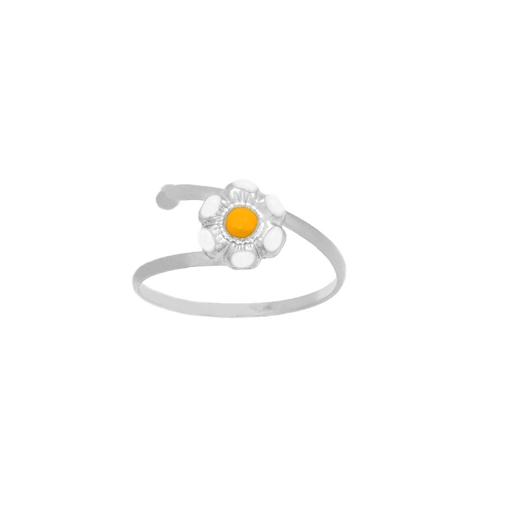 Παιδικό δαχτυλίδι από ασήμι 925 στολισμένο με μια μαργαρίτα από σμάλτο με δυνατότητα αυξομείωσης μεγέθους.