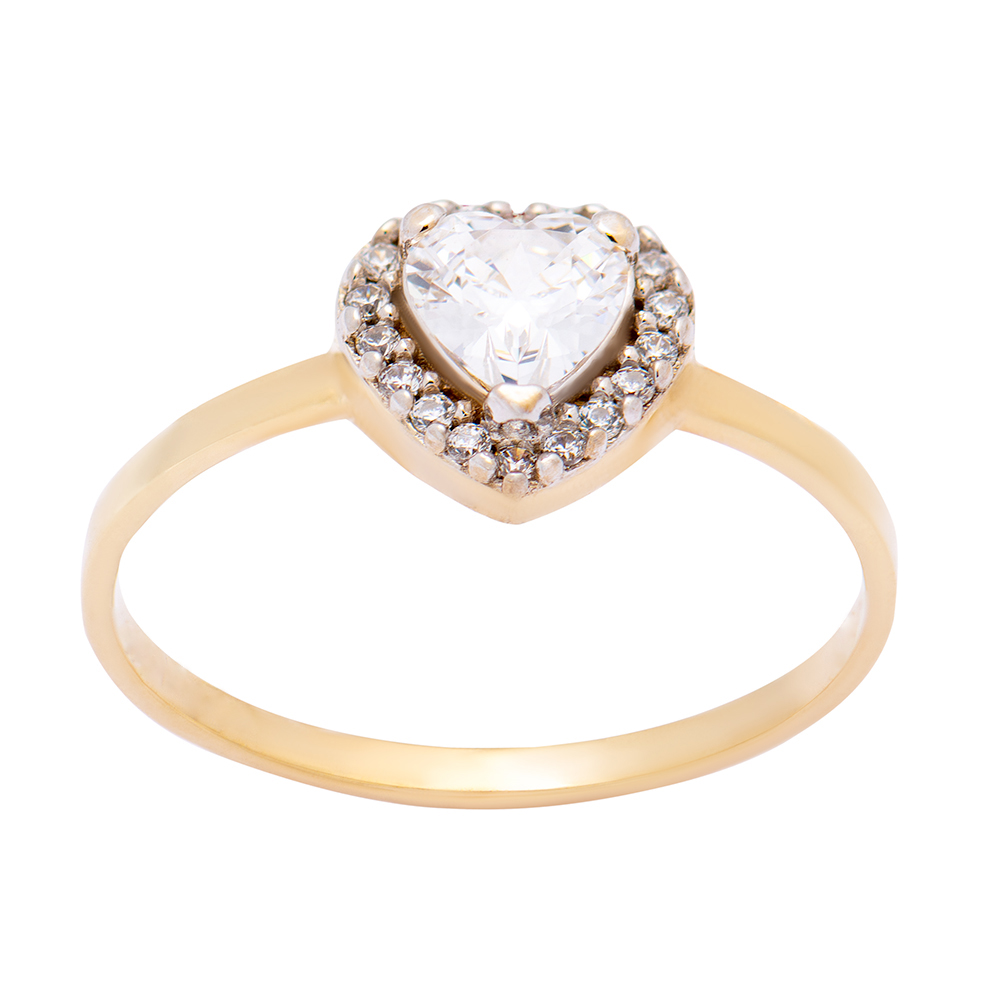 Χρυσό δαχτυλίδι 9 καρατίων σε σχήμα κοπής καρδιάς στολισμένο με λευκές πέτρες ζιργκόν.