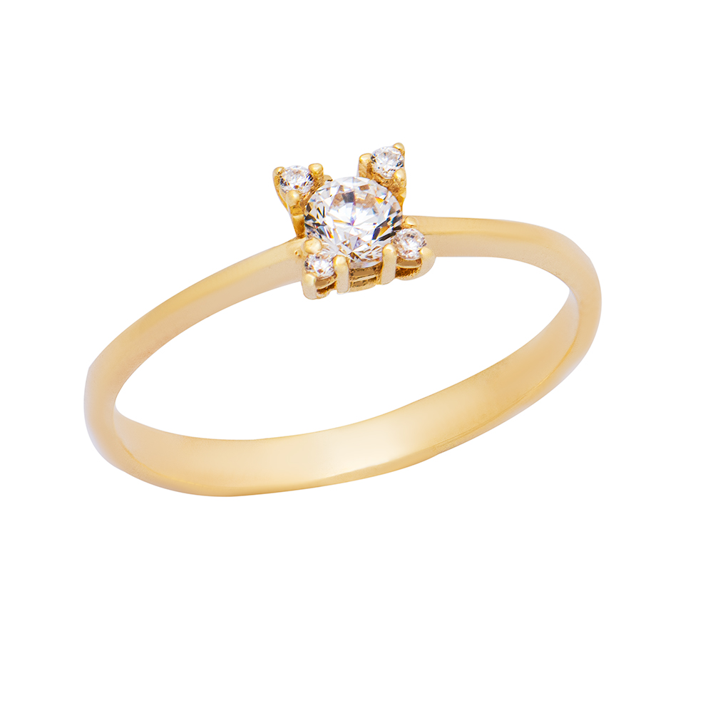 Ένα διακριτικό χρυσό δαχτυλίδι 9 καρατίων μονόπετρο με λευκή πέτρα ζιργκόν.