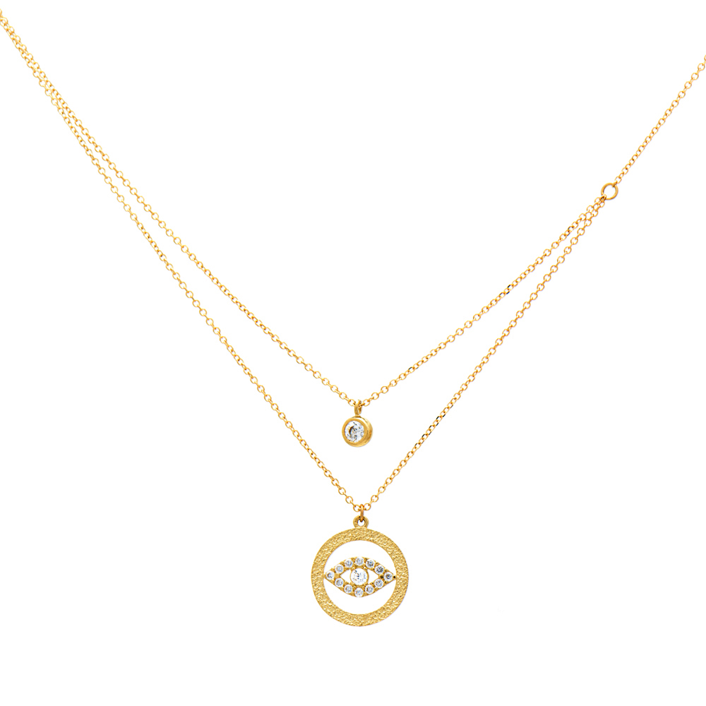 Χρυσό κολιέ 14 καρατίων διπλή αλυσίδα  με στρογγυλό μάτι και λευκή πέτρα ζιργκόν.