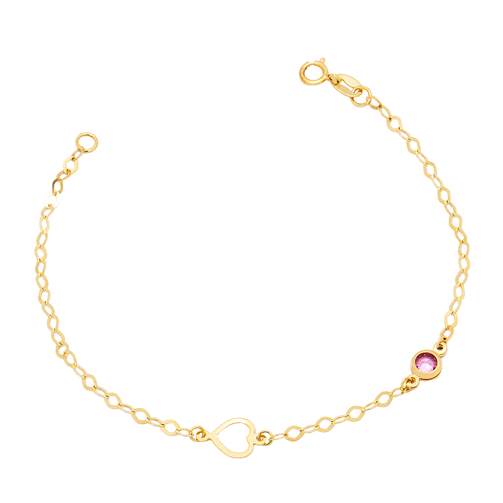 Χρυσό παιδικό βραχιόλι 9 καρατίων στολισμένο με μια καρδιά και ένα ροζ στρογγυλό ζιργκόν.