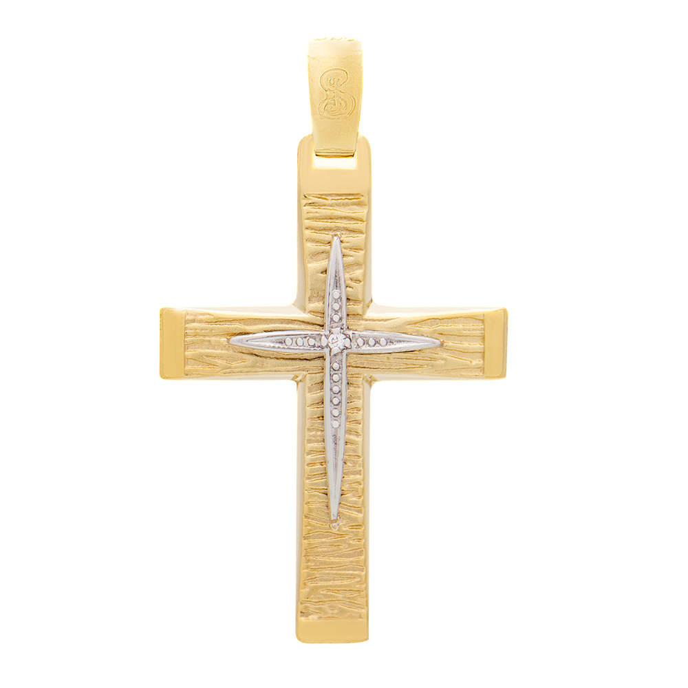 Χρυσός γυναικείος σταυρός 14 καρατίων στολισμένος με μια λευκή πέτρα ζιργκόν στο κέντρο. Ιδανικό δώρο βάπτισης για κορίτσι.