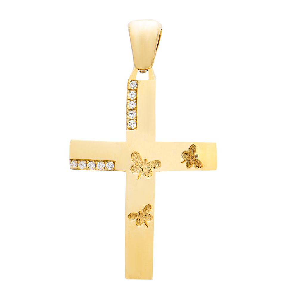 Χρυσός σταυρός 14 καρατίων στολισμένος με λευκές πέτρες ζιργκόν και πεταλούδες. Ιδανικό δώρο βάπτισης για κορίτσι.