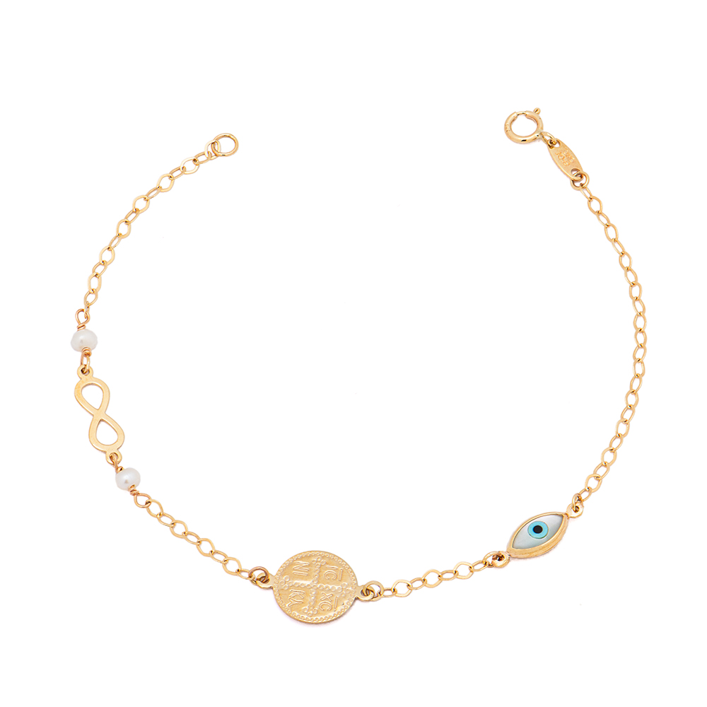 A Unique Gold bracelet K9 Christian Charm with eye and infinity.
