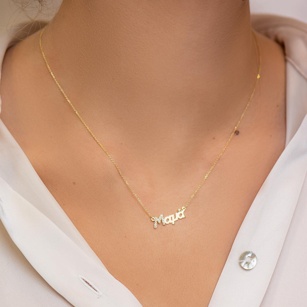 Κολιέ χρυσό 14 καρατίων “Μαμά” στολισμένο με λευκές πέτρες ζιργκόν.