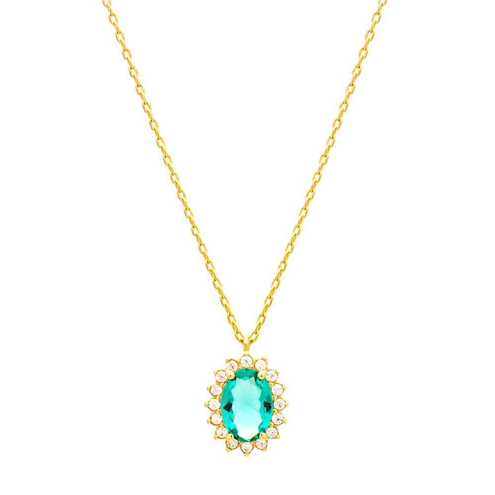 Χρυσό κολιέ 9 καρατίων ροζέτα σε σχήμα κοπής οβάλ με πράσινο Paraiba Tourmaline ζιργκόν και περιμετρικές λευκές πέτρες.