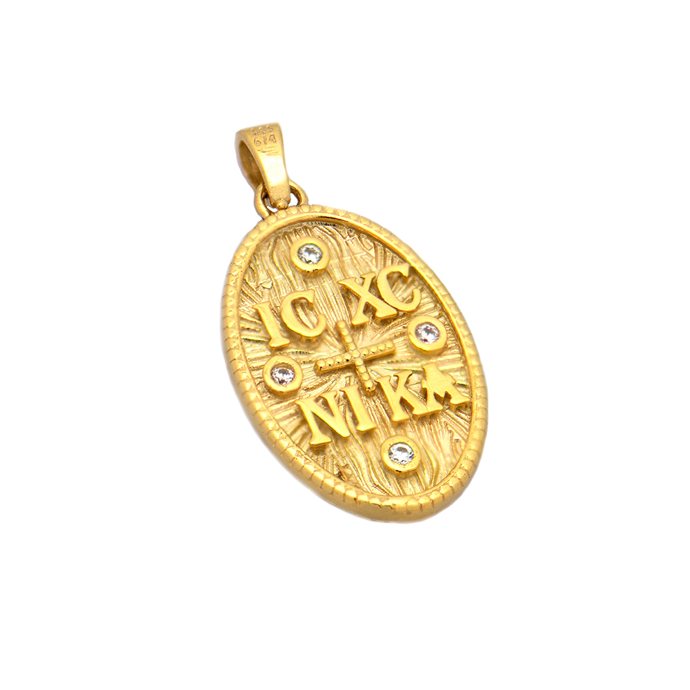 Κωνσταντινάτο-Φυλαχτό 9 καρατίων διπλής όψεως σε οβάλ σχήμα με λευκές πέτρες ζιργκόν.