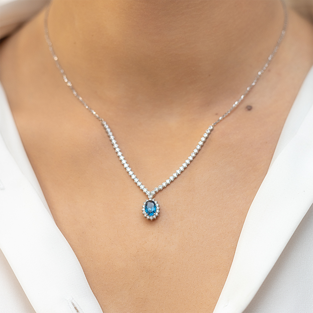Λευκόχρυσο κολιέ 14 καρατίων ροζέτα σε σχήμα κοπής οβάλ με London Blue ζιργκόν και ριβιέρα με λευκές πέτρες.