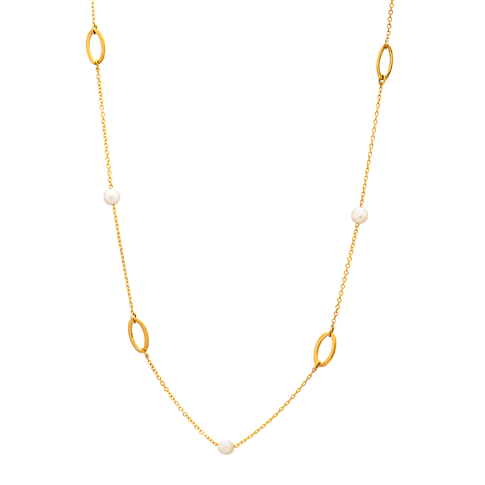 Women’s Jewelry Set 14ct Gold with a Necklace with perforated oval rings and pearls and a Bracelet with a corresponding design, ideal for an engagement gift.