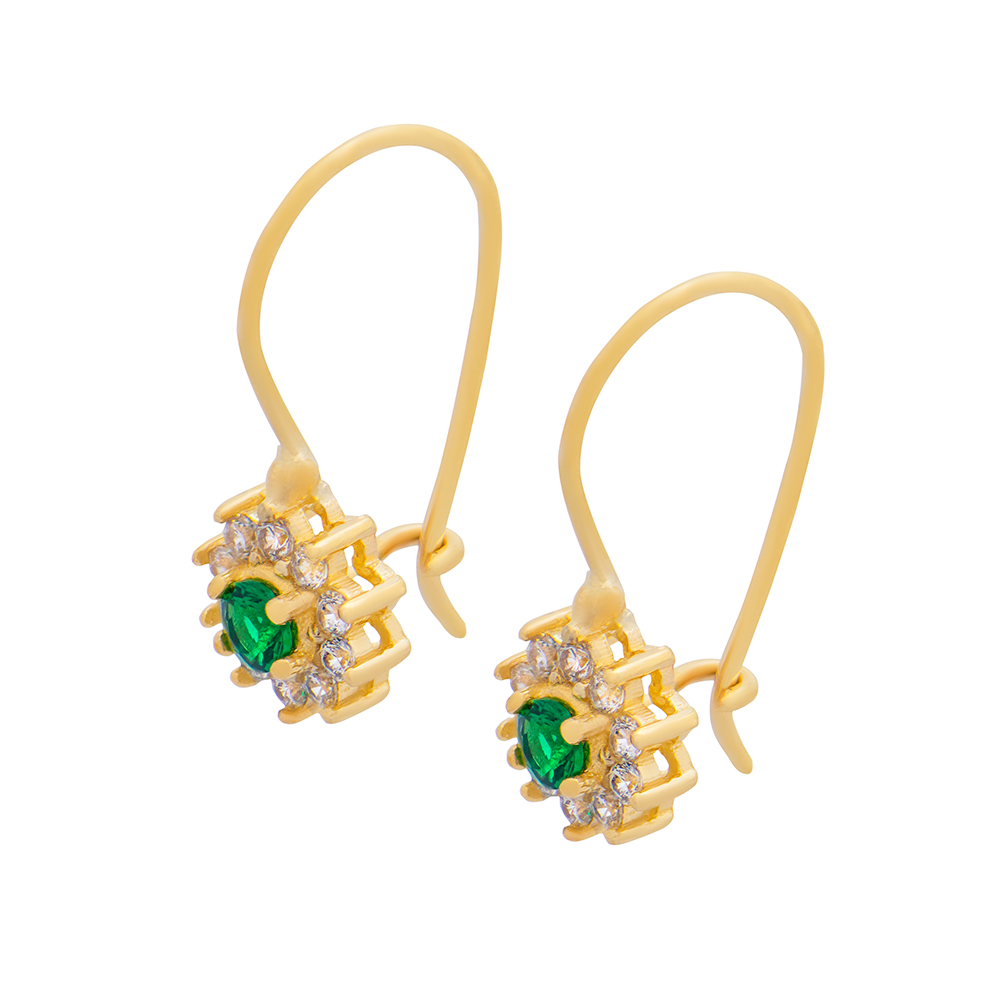 Χρυσά σκουλαρίκια 9 καρατίων κρεμαστά ροζέτα με πράσινο κέντρο.